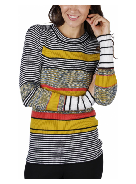 Een rib gebreide cashmere pull met een ronde hals. De kleuren zijn zwart, wit, moster en zacht rood. Het motief is breed en fijn gestreept wat een leuk effect geeft. Deze pull zit heerlijk zacht en is slimfit!