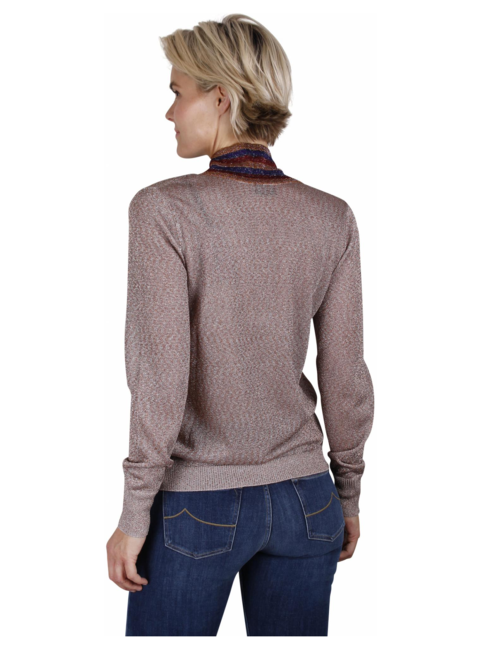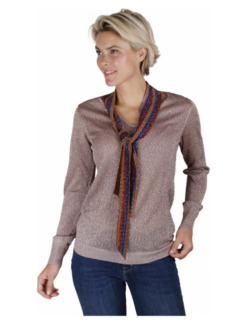 Rose pull met een v-hals en glitter kleurige sjaalkraag oranje, blauwpaars, rood.