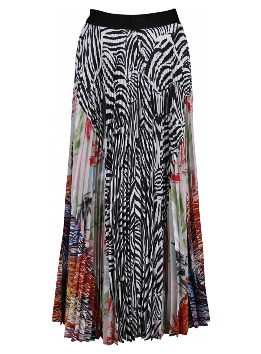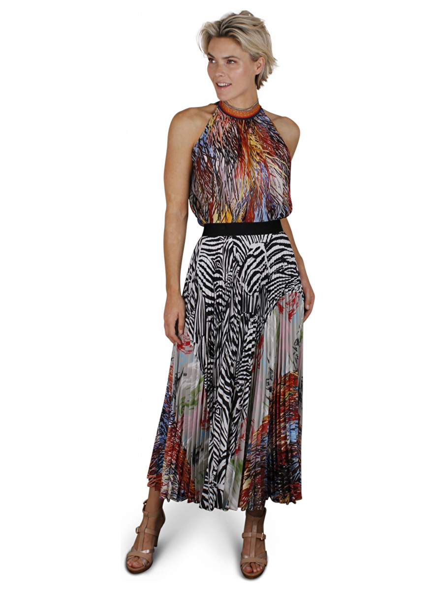 Multi color plissé rok met zebra en abstract dessin. Deze heeft een elastische tailleband, ritsluiting en drukknoopjes.
