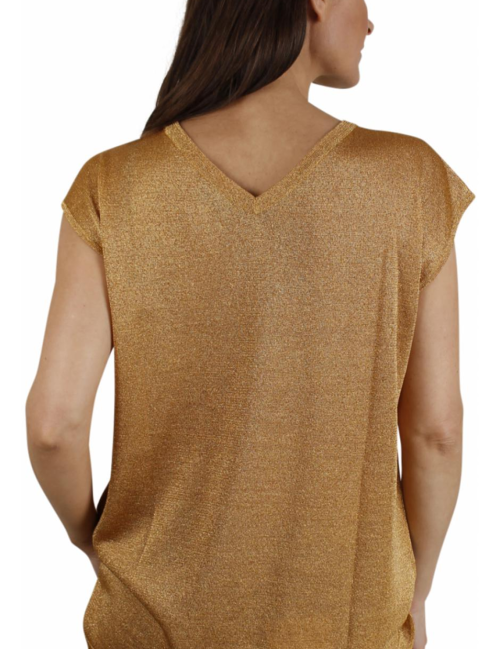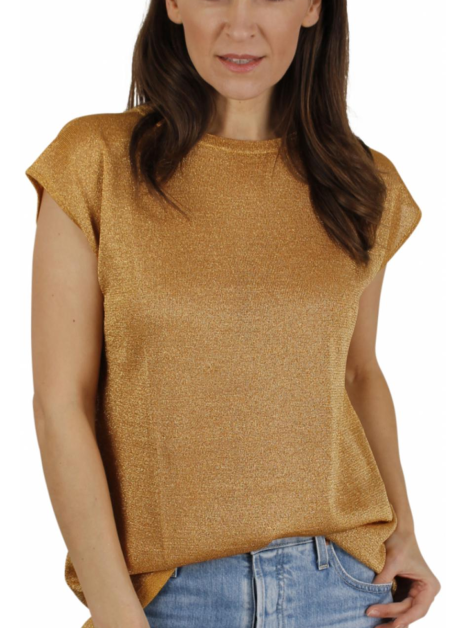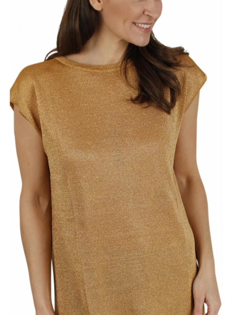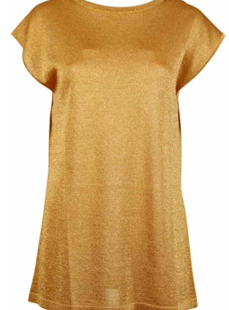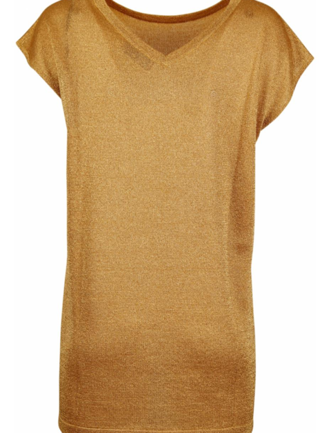 Oversized top met een glanzend glitter effect in warm goud. De halslijn is rond met aan de achterkant een v-hals. De mouwen zijn kort (kapmouw).