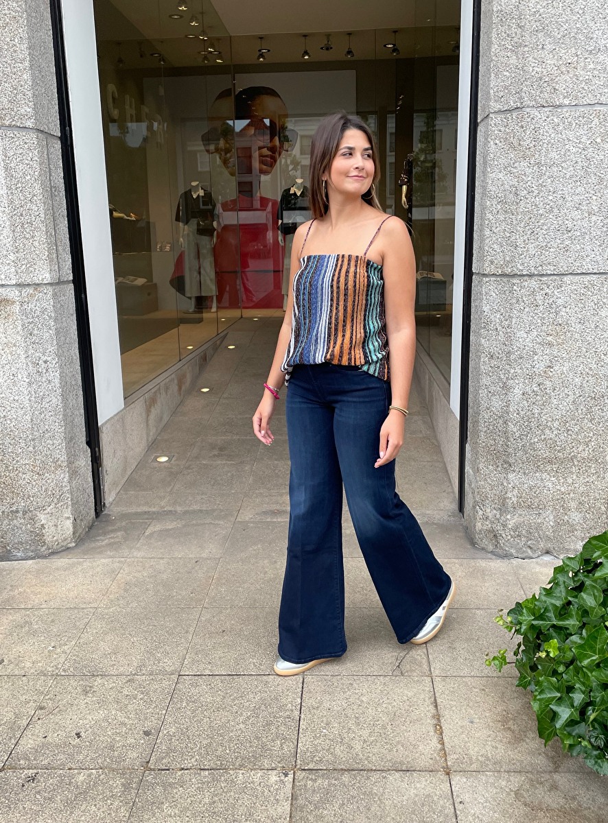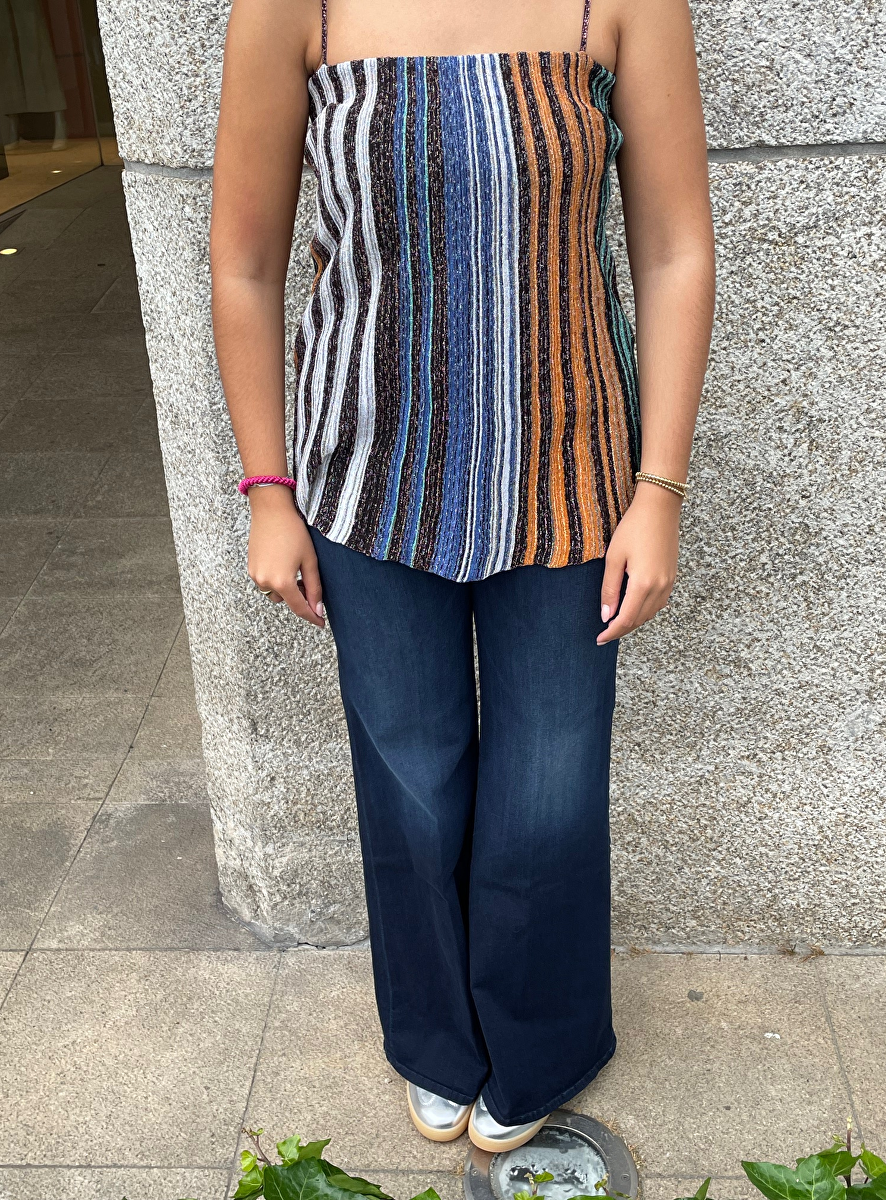 Top in gestreept lurex multicolor, zwart, oranje. Deze heeft een elastische bovenkant en spaghetti bandjes.