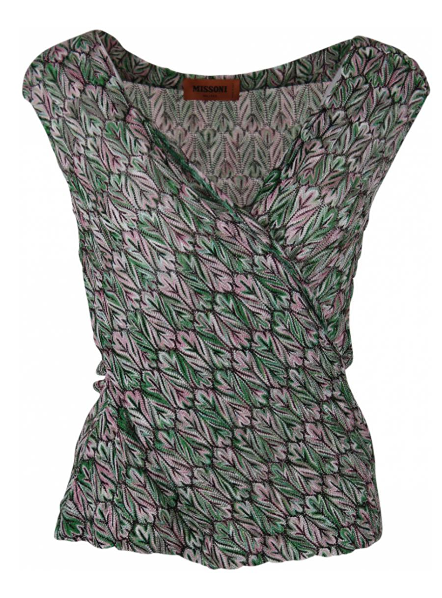 Top met overslag v-hals met blad dessin en een roze glitter draad accent. Deze heeft een licht gedraaid effect in de taille.
