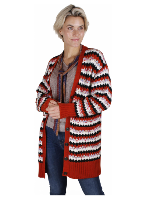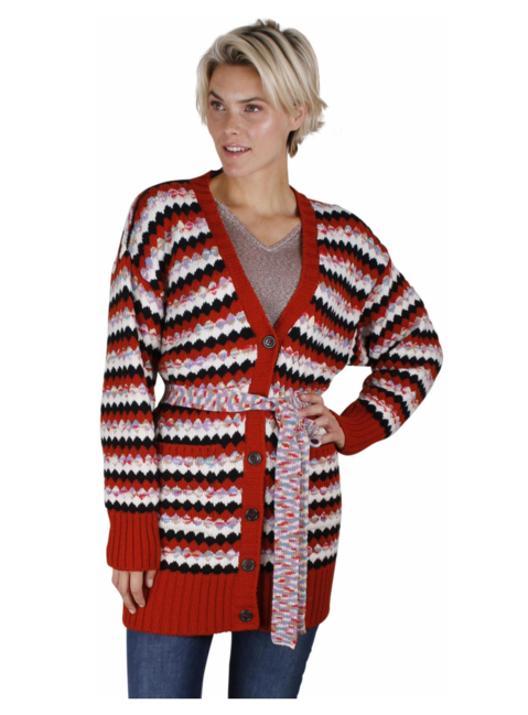 Steenrood v- hals vest in Missoni wave dessin met zwart blauw, taupe en wit. Deze sluit met zes knopen. Twee grote zakken. gebreide ceintuur.