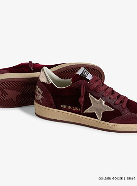 Golden Goose Ball Star sneaker velvet bordeaux, deze luxe sneaker combineert een sportieve uitstraling met verfijnde details. De rosé gouden details geven een speelse, maar toch chique twist aan je outfit. Draag deze stijlvolle sneakers met een leren broek en oversized knit voor een stoere herfstlook die zowel comfortabel als stijlvol is.