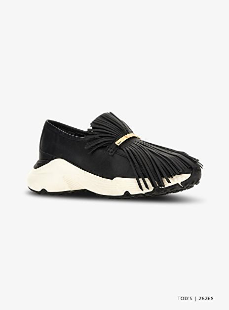Op zoek naar een elegante sneaker die wel opvalt? Dan is de Tod's sneaker kate zwart met franjes misschien de sneaker die precies in jouw garderobe past. Het soepele zwarte leer wordt stijlvol geaccentueerd met subtiele franjes, wat dit model een moderne en vrouwelijke uitstraling geeft. Dankzij de verfijnde afwerking combineer je deze sneaker moeiteloos met een wolmix pantalon en trenchcoat voor een moeiteloze kantooroutfit of een city stroll waarbij comfort en stijl centraal staat.