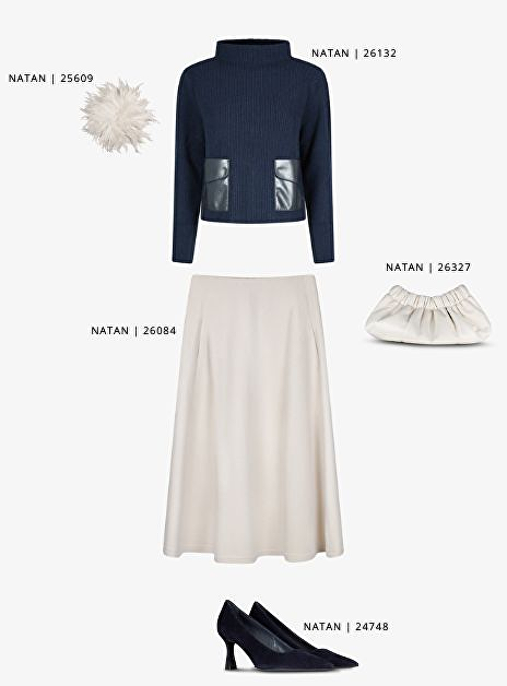 Deze complete look van Natan is een toonbeeld van winterse elegantie. De Pull Maui in marineblauw wol met lederen details geeft warmte en een moderne twist, terwijl de beige wollen rok Dublin zorgt voor een zachte, vrouwelijke balans. De marineblauwe pumps in suède tillen de outfit naar een verfijnd niveau en zorgen voor een slanke, elegante uitstraling. Met de offwhite Dyonis tas voeg je een frisse, lichte touch toe die prachtig contrasteert met de donkere tinten van de winter. De verenbroche maakt het geheel af en geeft de outfit een vleugje feestelijke luxe, ideaal voor diners, winterse events of een stijlvolle dag op kantoor. Kortom: een outfit die laat zien dat warmte en comfort hand in hand gaan met klasse en verfijning, perfect om stijlvol de winter in te gaan!