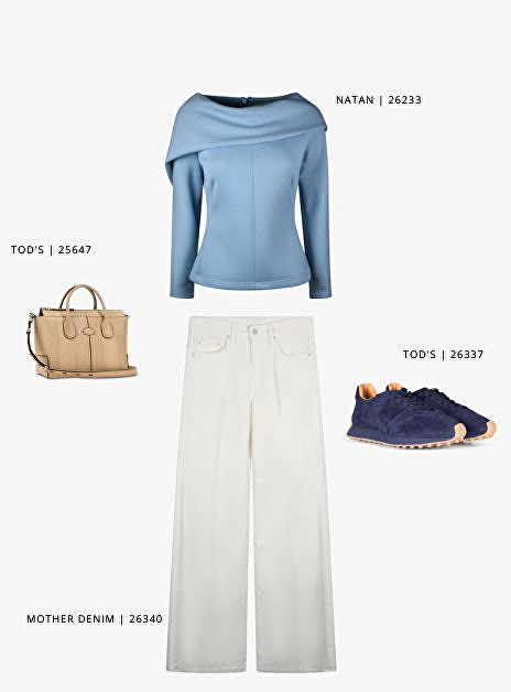 Zo stijl je de Tod's slangenleder beige shopper perfect af met de lichtblauwe top van Natan, de witte jeans van Mother denim en voeg je dit samen met de Tod's sportieve suede sneakers is jouw outfit helemaal perfect.