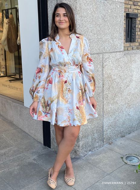 Niets voelt zo verfrissend als linnen op hete middagen. De Ascension Plunge Mini Dress van Zimmermann, uitgevoerd in lichtblauw linnen met tropische print, valt luchtig rond het lichaam en droogt razendsnel nadat je even pootje hebt gebaad.