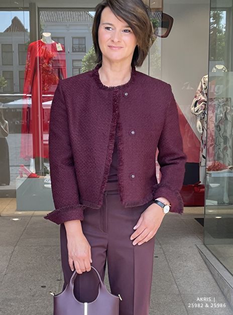 Heb je zin in moderne tailoring? Trek de bordeauxrode Akris-blazer aan met de bijpassende pantalon; de tweedstructuur en gerafelde randen geven precies genoeg textuur om op te vallen zonder schreeuwerig te zijn.