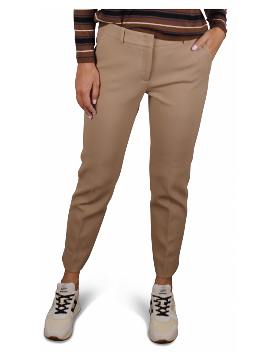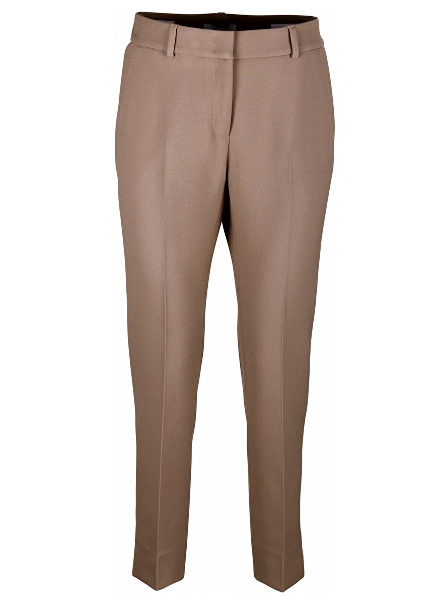 Camel broek met ceintuur lussen. Steekzakken. Zakken met knoopsluiting aan de achterkant. Detailsteek zijkant broekspijp en zakken. Persvouw. Splitje onderkant broekspijp 6cm.