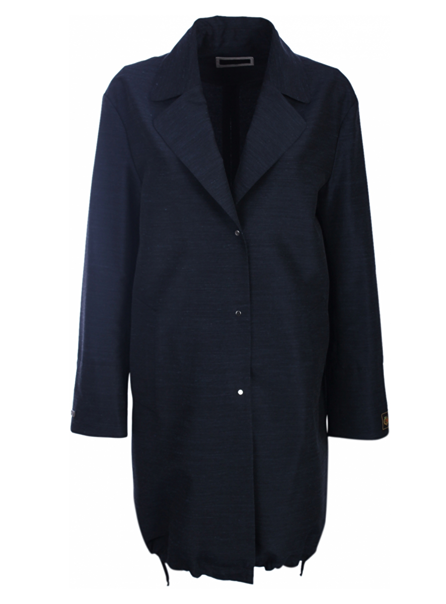 Jas lang in een gemelleerde marine tint. Deze fashion jas heeft een hals met revers en kan gesloten worden door zilverkleurige drukkers. Aan de voorzijde twee zakken. Het materiaal bestaat uit 37% fibra, 31% wol, 18% zijde en 14% linnen.