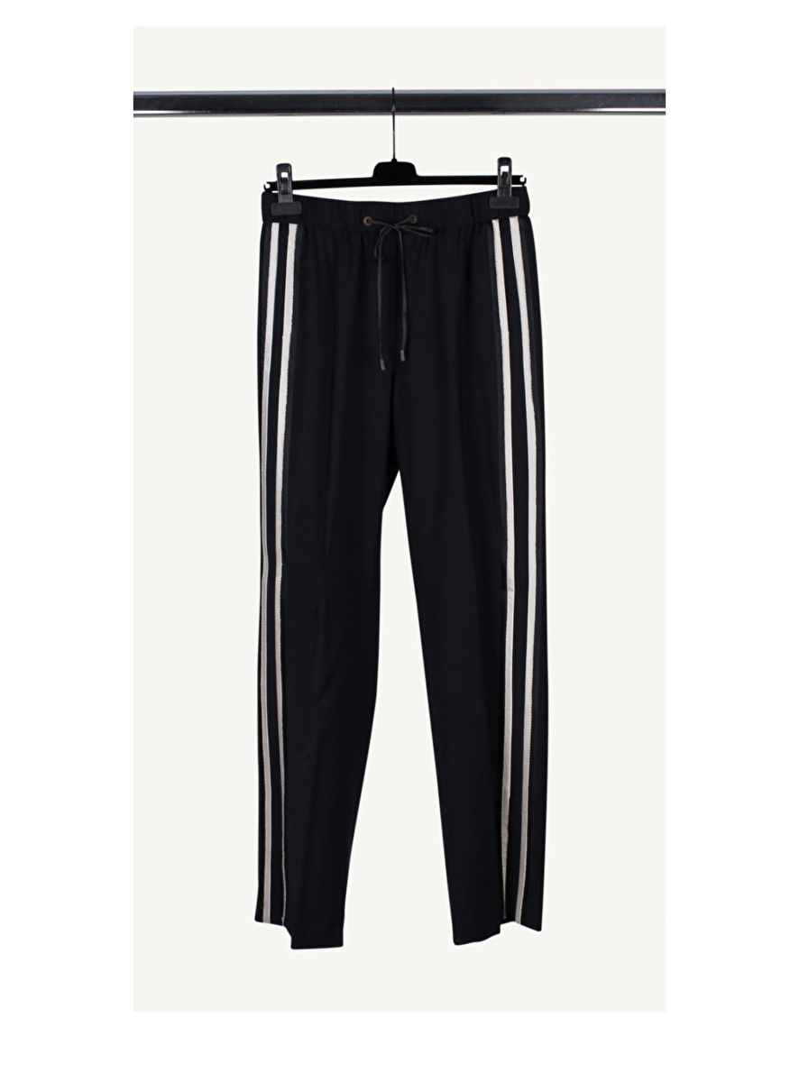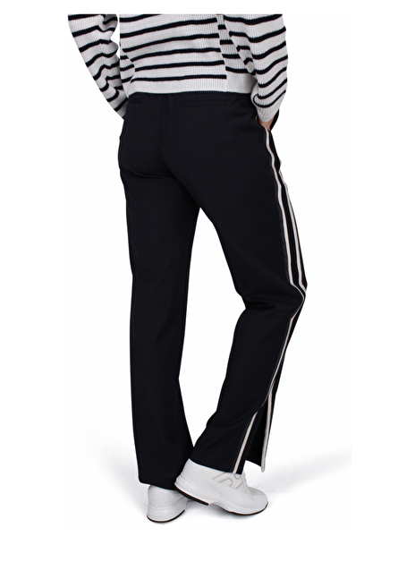 Deze sportieve marine pantalon met steekzakken is van cool wool. De taille is voorzien van elastiek en satijnen aantrekkoord. De zijkant van de pantalon is afgezet met een subtiele tweekleurige bies zwart en rosegoud. Leuk te dragen met een sneaker of mocassin.