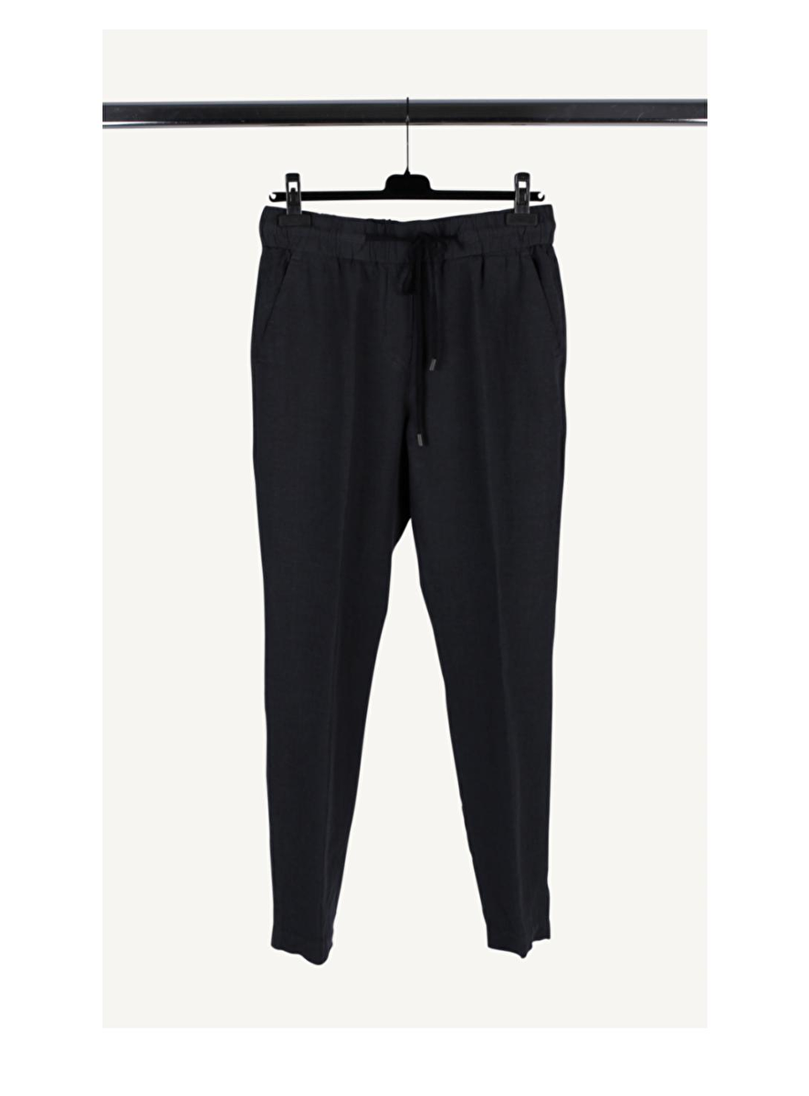 Marine pantalon in linnenlook met steekzakken. De taille is voorzien van elastiek en een aantrekkoord. De achterkant heeft twee paspelzakken. Deze marine broek geeft een fijne nonchalante stijl.
