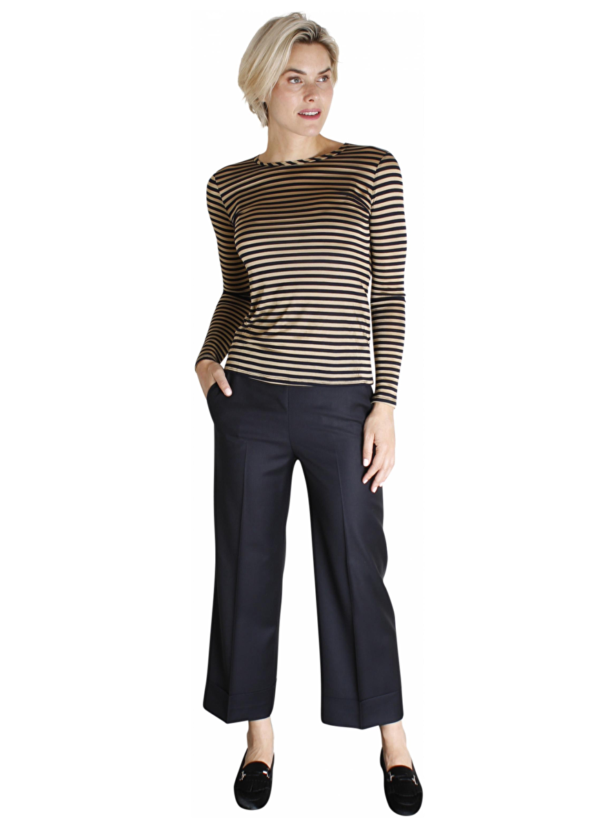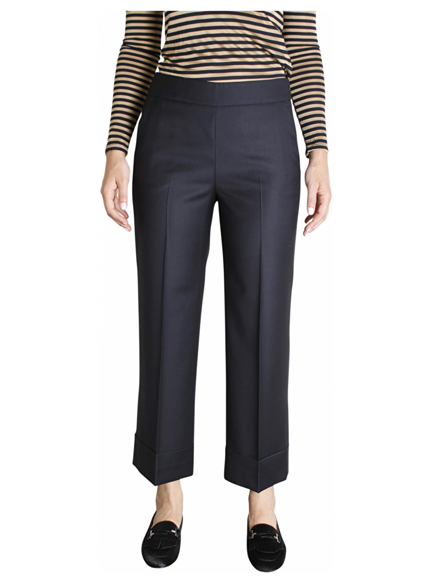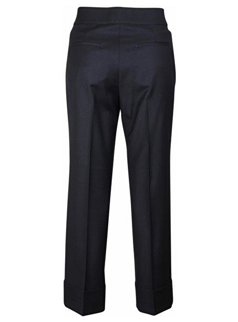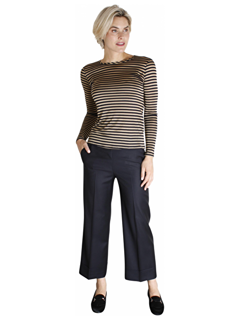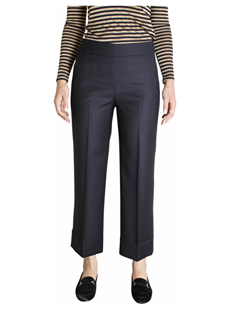 Prachtige marine 7/8 pantalon in culottestyle. De broek heeft steekzakken en aan de achterkant paspelzakken. De sluiting zit aan de linkerzijde. Aan de onderkant heeft de broek een extra brede omslag van 9cm.
