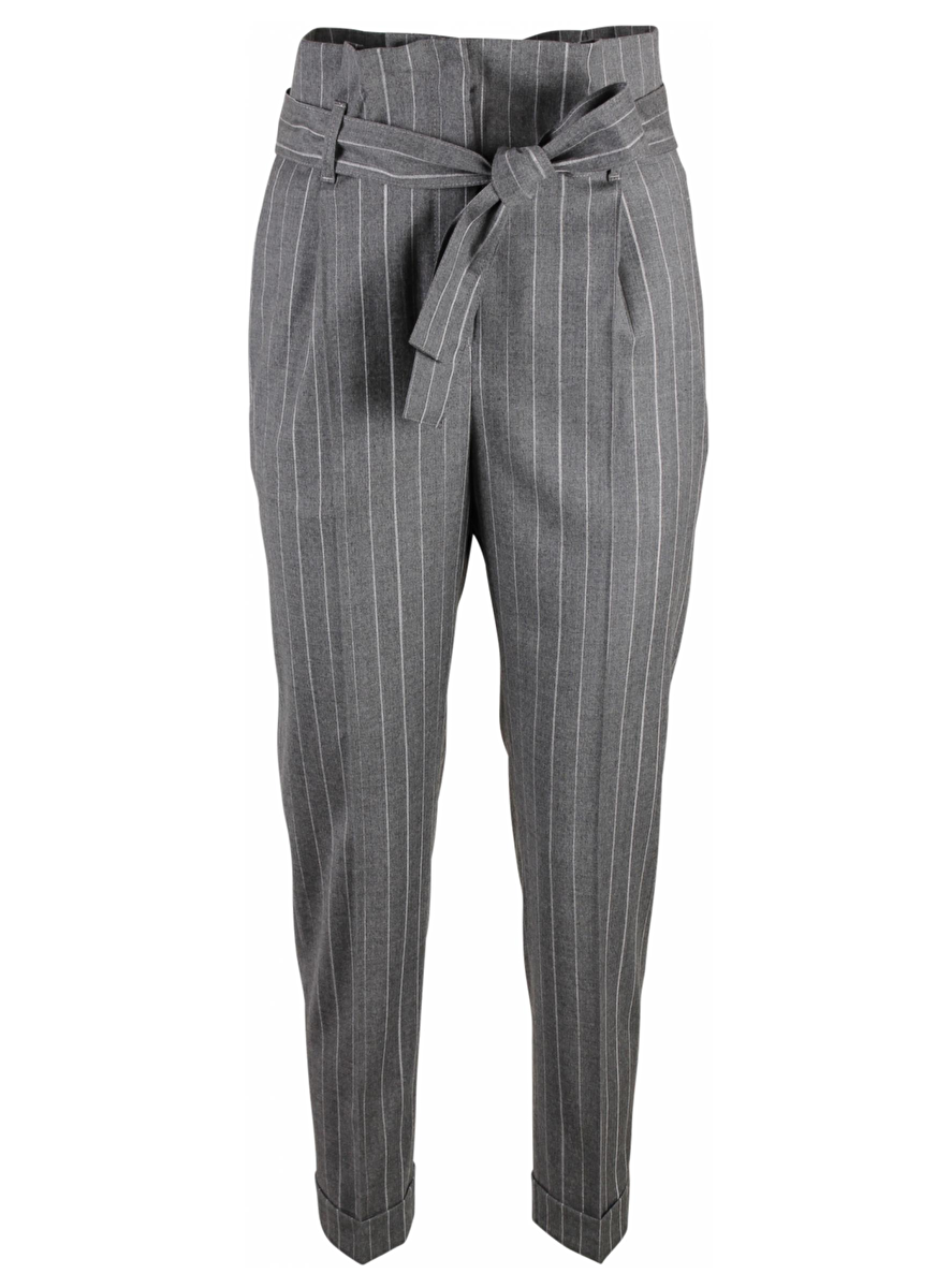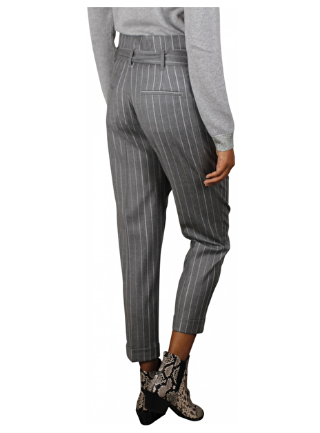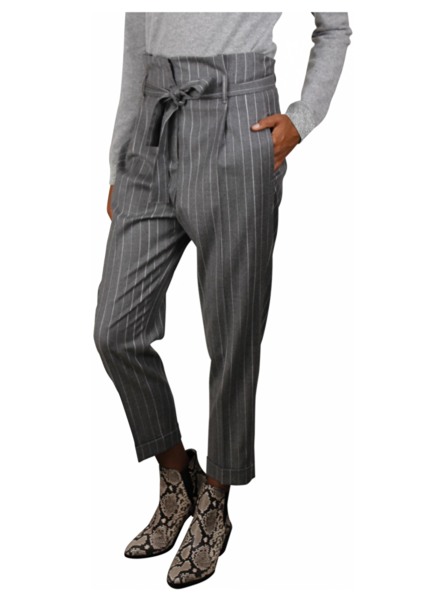 Mooi vallende licht grijze krijtstreep paperbag. Deze pantalon heeft steekzakken, een hoge slanke taille, is door de bandplooi iets royaler op de heup en dan taps toelopend en een persvouw. De achterkant heeft ook twee zakken. De broekspijpen hebben een kleine omslag 4cm.