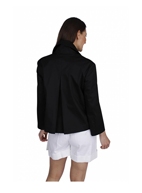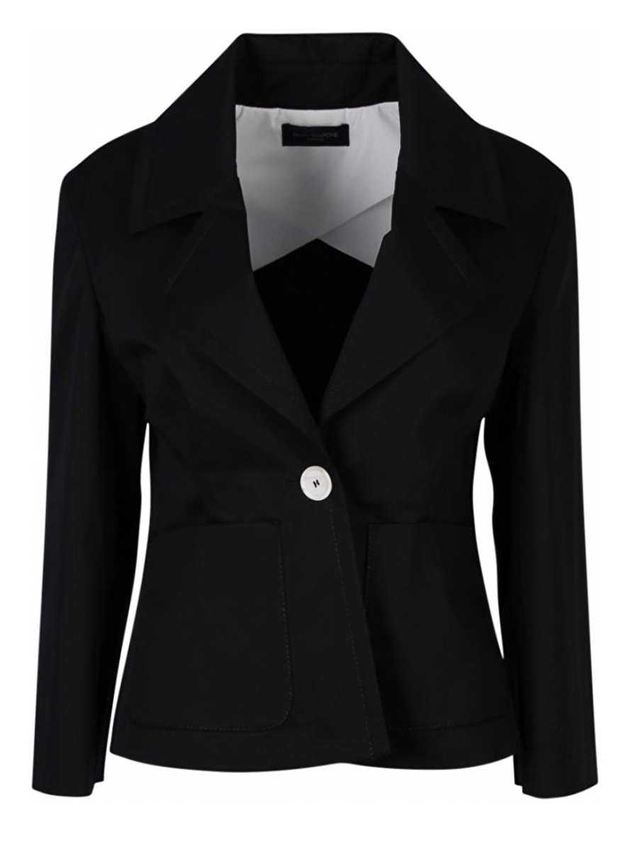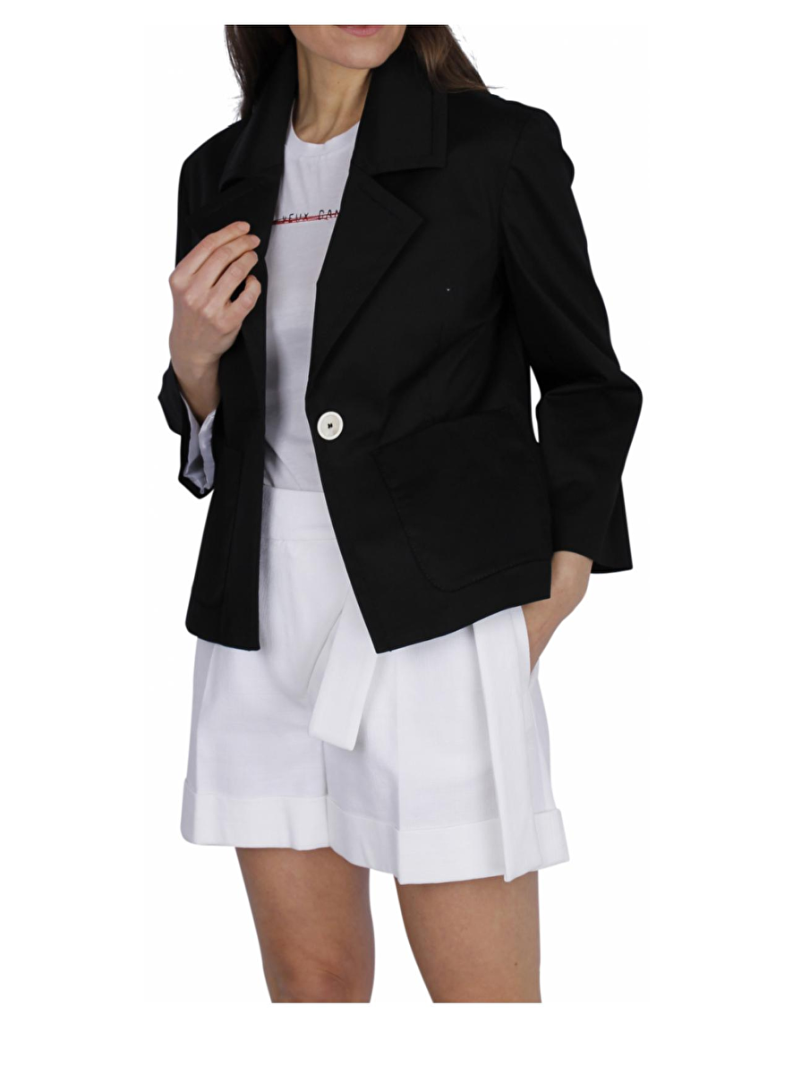 Deze zwarte blazer heeft een brede rever en sluit met één witte knoop. Aan de achterkant heeft deze een grote stolpplooi. Aan de voorkant zitten twee grote zakken met een afgeronde zoom. De binnenkant is afgewerkt met witte biezen en heeft een diagonaal inzet van beige katoen. Een korte blazer met een pittig gesneden look!