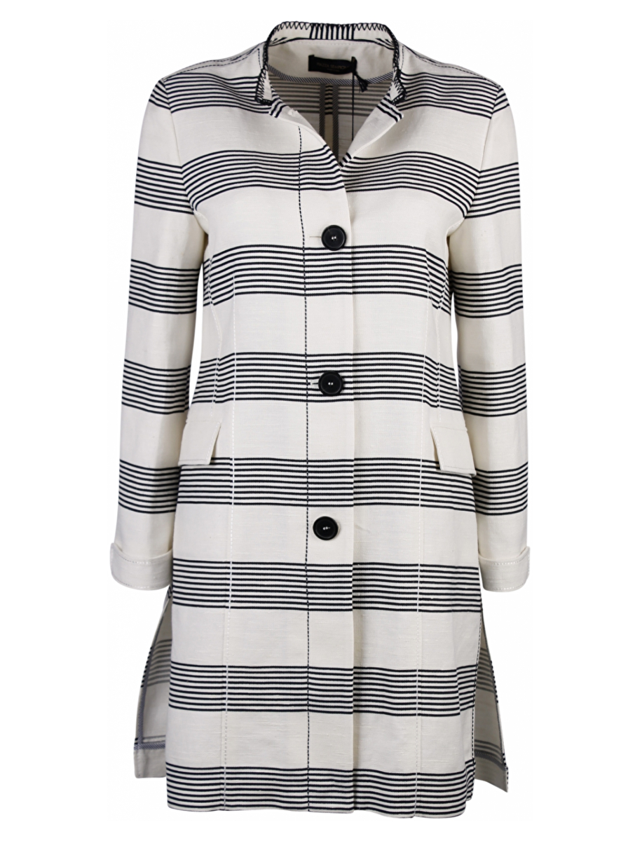 Deze Off-White lange jas is navy gestreept met feston steken. De kraag is rond en de sluiting heeft vier grote knopen. De zijkanten van de jas hebben twee splitten van 28 cm. De voorkant van de jas heeft twee steekzakken met klepjes en de mouwen hebben een extra manchet.