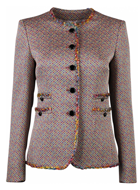 Deze blazer heeft diverse pastelkleuren. Een mooi detail is de kleurige afgewerkte sierband en dubbele paspel zakken. Het materiaal is 54% polyester, 20% katoen,15% nylon, 6% acryl, 3% elastan. Fijn te combineren op bijvoorbeeld een pantalon, jeans of rok.