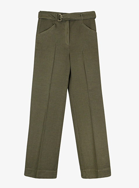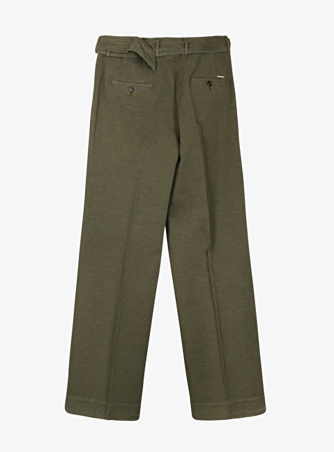 Detail: stoffen ceintuur met D gesp - taille met ceintuurlussen - zakken - persvouw - paspelzakken met knoop aan de achterkant - brede zoom onderkant broekspijp.