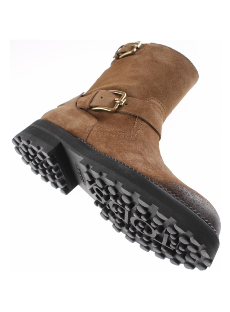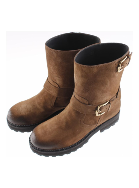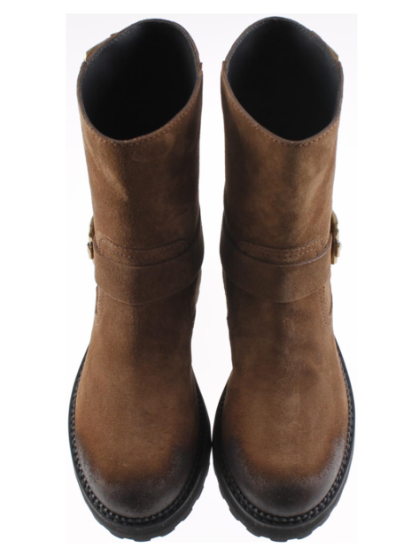 Deze laars in bruin suede is heel stoer door de neus die gepoetst is en daardoor een stuk donkerder van kleur. Met zijn enkel en kuit strep en goudkleurige gespen echt een biker style. De hak is 3cm en de stoere dikke zool 1,5cm. Uiteraard zitten er tods noppen en een gestanst brand logo in de rubberen zool.