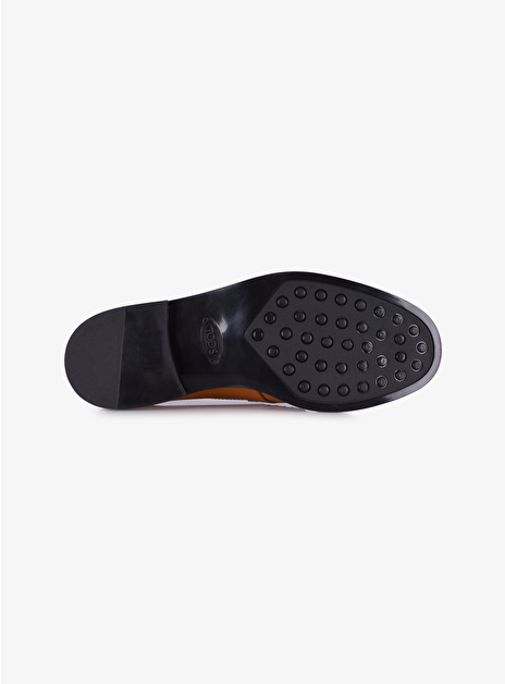 Prachtig vormgegeven mocassin in warm oranje met een contrast zool in zwart. Een echte klassieker.