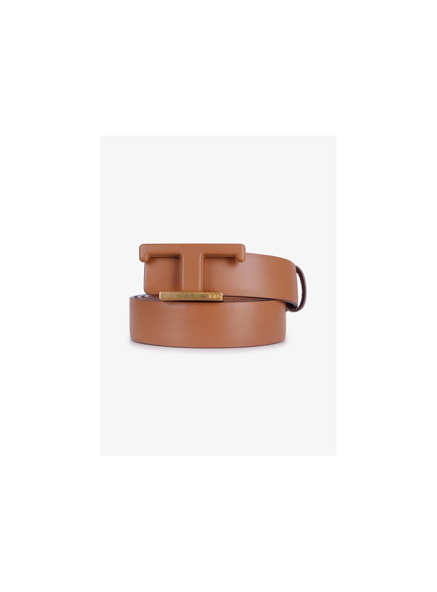 Detail: T gesp met mat goud beslag en leer.