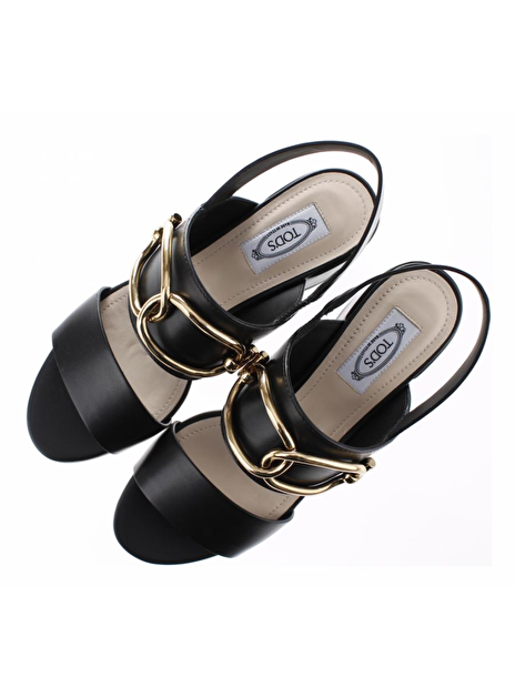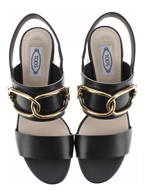 Mooie vrouwelijke sandalettes van Tod's. De schoen is uitgevoerd in zwart leder. De hakhoogte is 7cm. 2 brede lederen banden lopen over de wreef en het smalle bandje wat aan de enkel gedragen wordt is ook van leder. De grote gouden gesp is echt een eyecatcher. De buitenzool is van leder en de onderkant van de lederen hak is rubber. Fijn, comfortabel en vrouwelijk mooi!