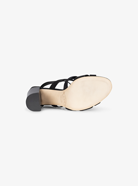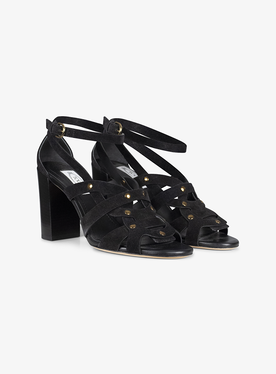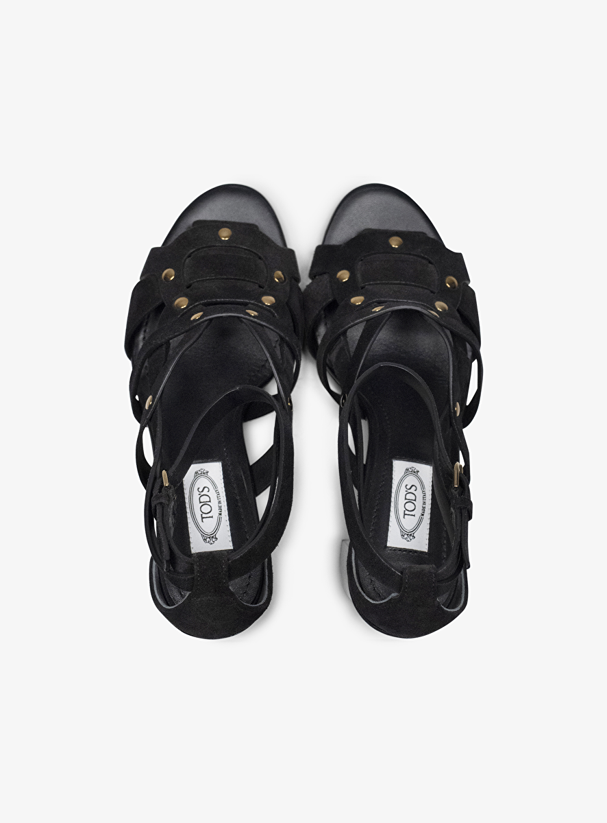 Wat een beauty deze sandalette van Tod's. Een mooie vrouwelijk 'high heel' met een hakhoogte van 9cm. De schoen is uitgevoerd in zwart suede, heeft een lijnenspel van bandjes die mooi over de voet lopen. De bandjes zijn met een soort goudkleurige drukker/spijker aan elkaar bevestigd. Hier komt vrouwelijk met een stoere touch helemaal tot zijn recht!