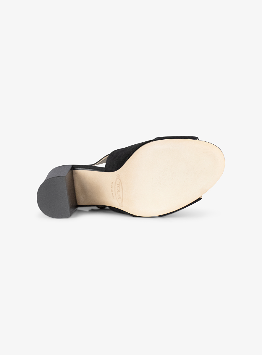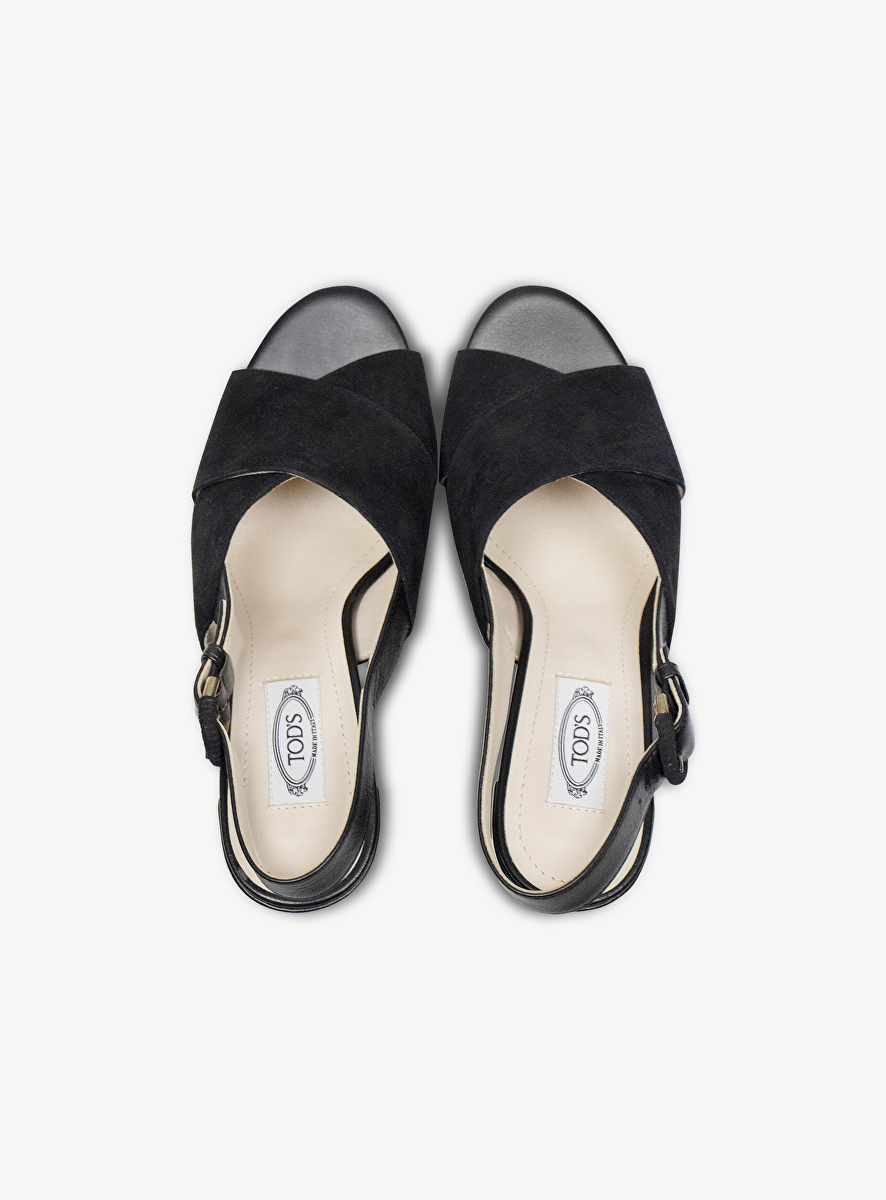 Een combinatie van draagbaar en vrouwelijkheid zijn deze sandalettes van Tod's. De schoen is uitgevoerd in zwart suede. De hakhoogte is 9cm. 2 brede banden in suede lopen kruislings over de voet en het smalle bandje wat aan de enkel gedragen wordt is van leder. De gespsluiting heeft een mooi fijn detail in suede. De buitenzool is van leder en de onderkant van de lederen hak is rubber.