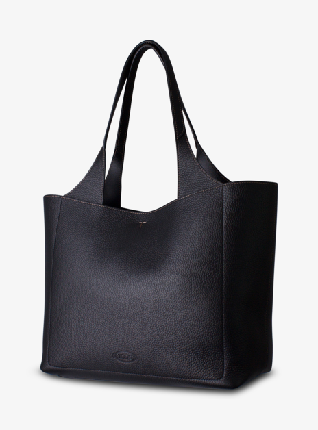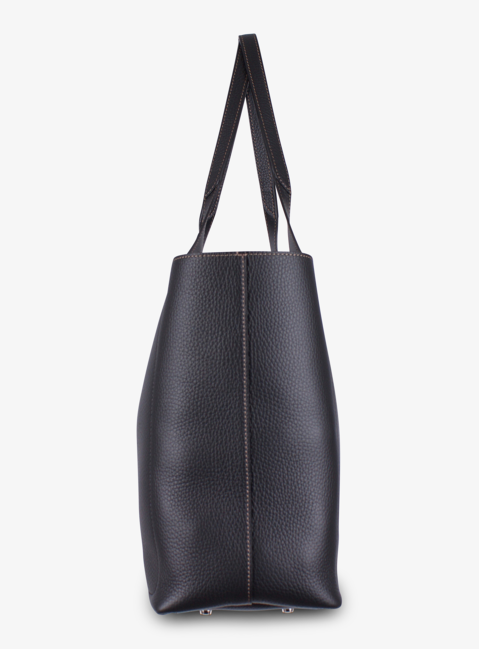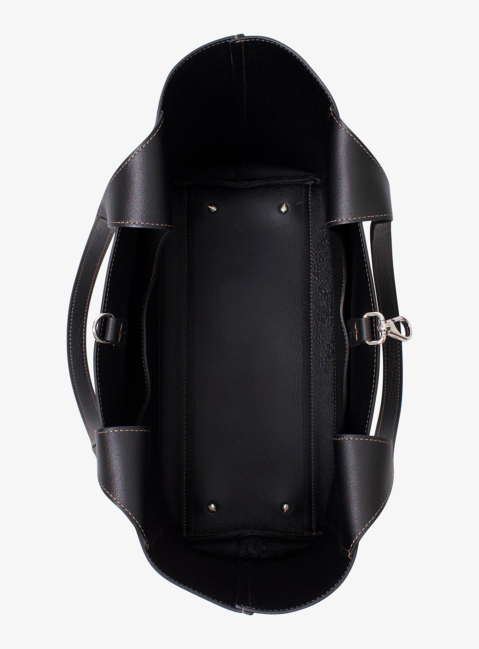- Detail: gestanst logo - haak en oogsluiting - 1 hoofdvak - 2 zijvakken verwerkt in de handvaten - metalen voetjes onder de tas.