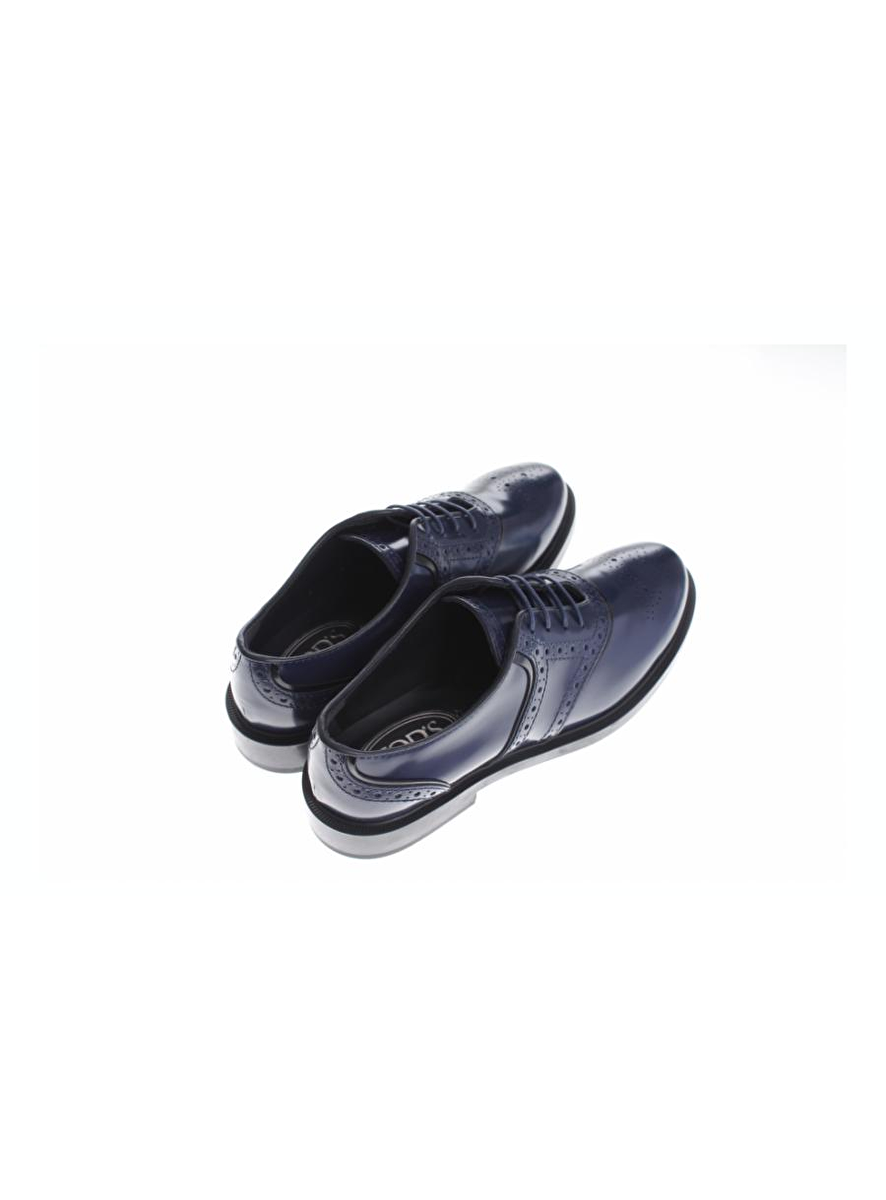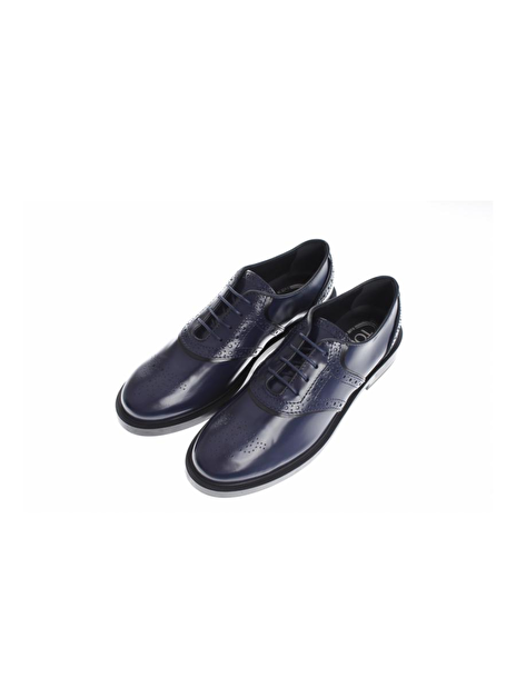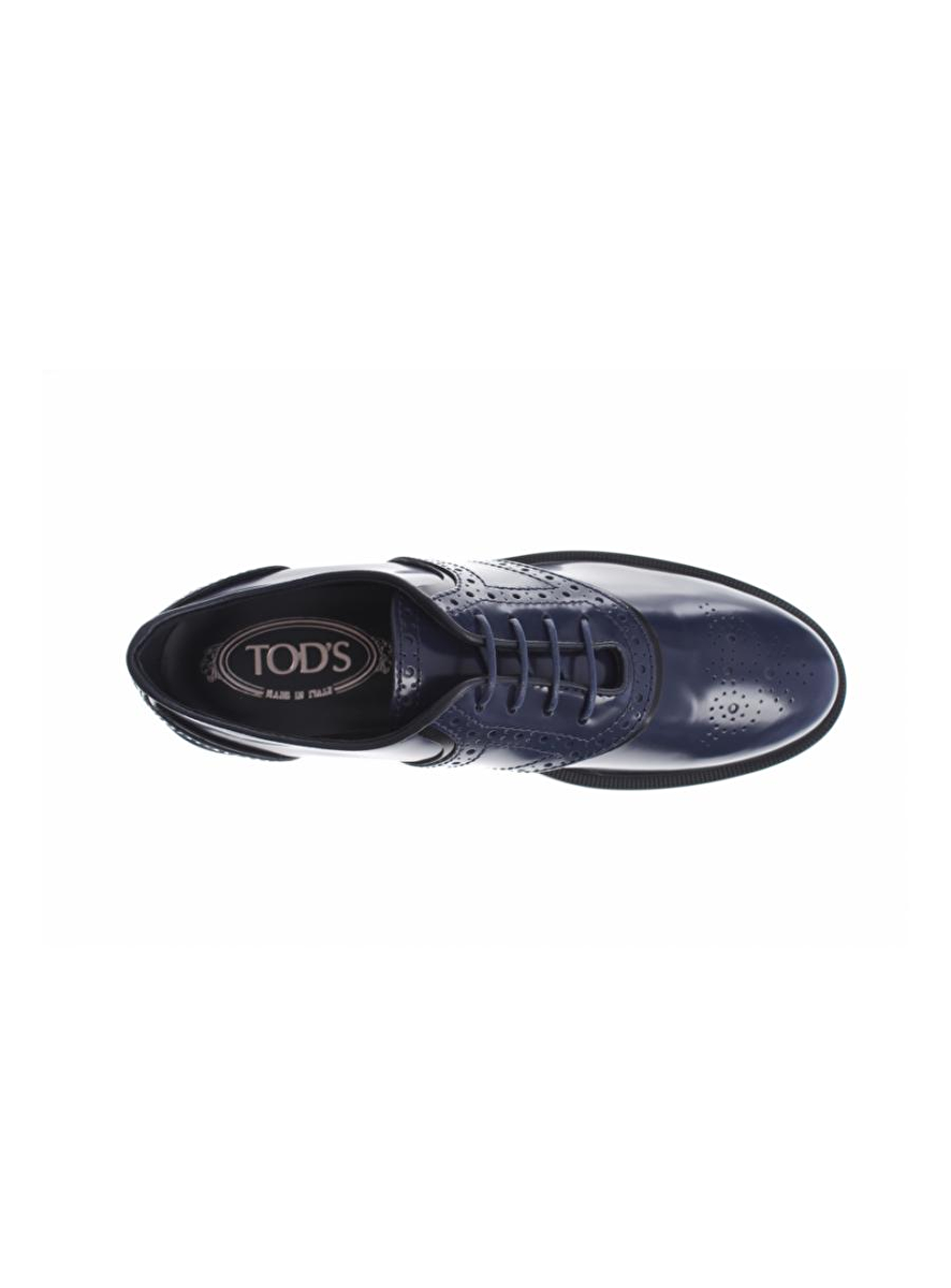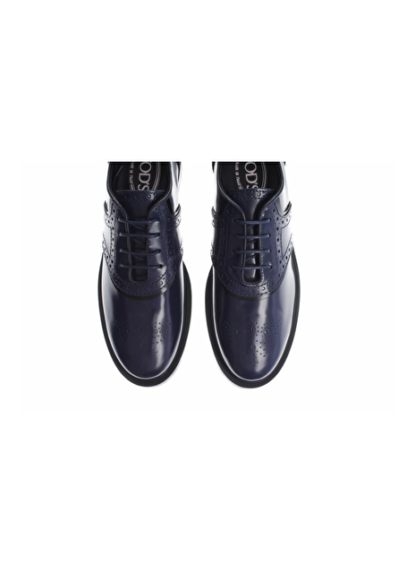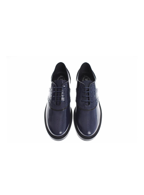 Veterschoen in inktblauw glansleder met zwarte biezen. De zool is zwart rubber en de hak is 3cm hoog. Echt een 'broque' van nu!