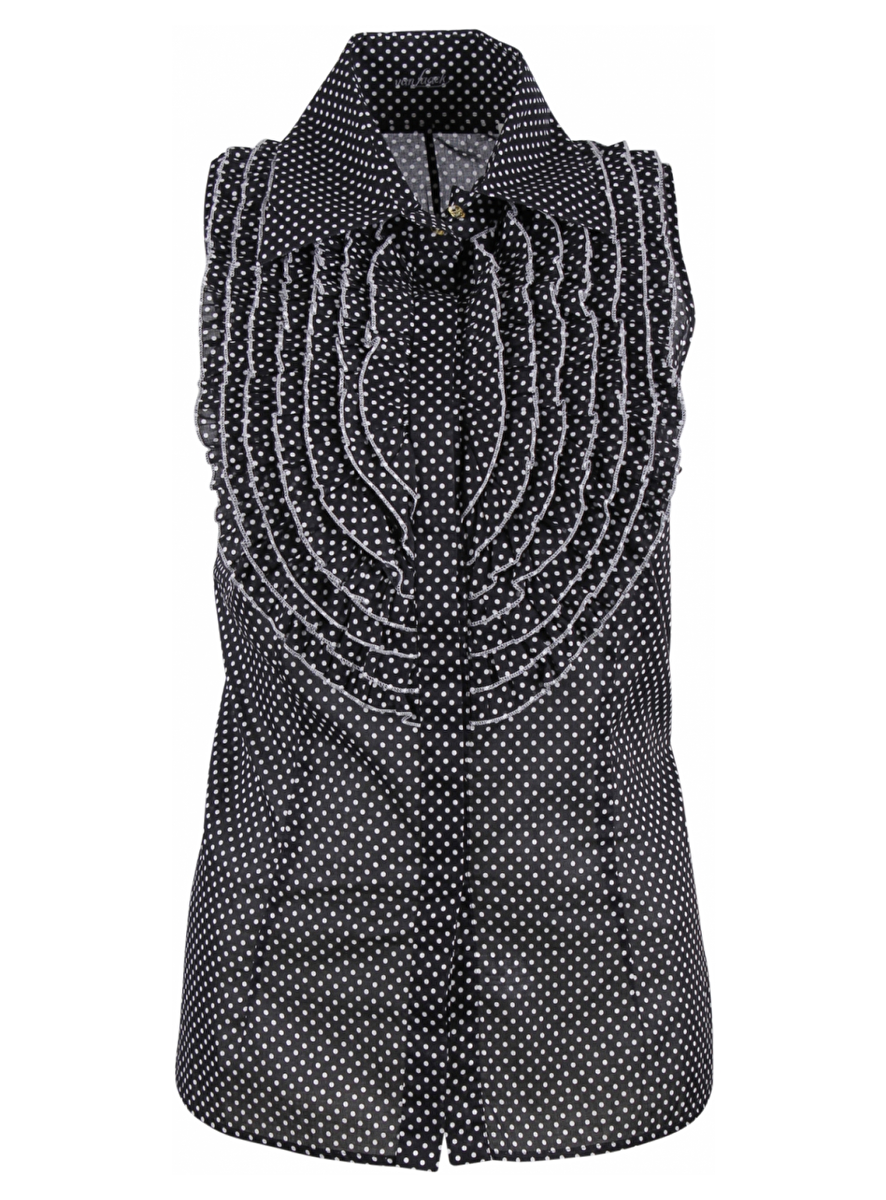Luchtige blouse met polkadot en roezel detail onder de kraag.