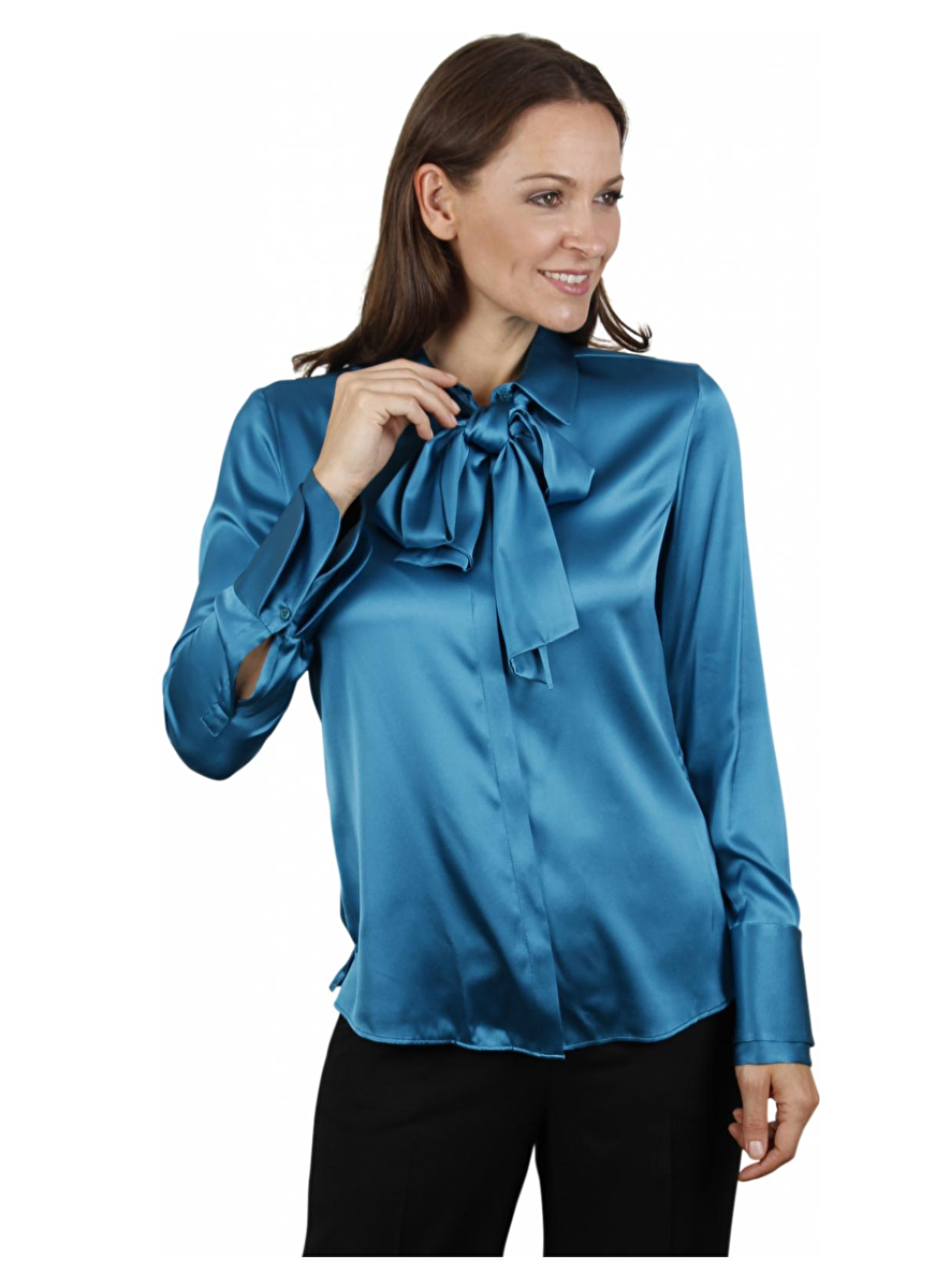 Blouse in petrol blauw met strik en lange dubbele afgeronde manchetten. Deze sluit aan (getailleerd) met knopen in een blinde zoom. Mooie warme kleur.