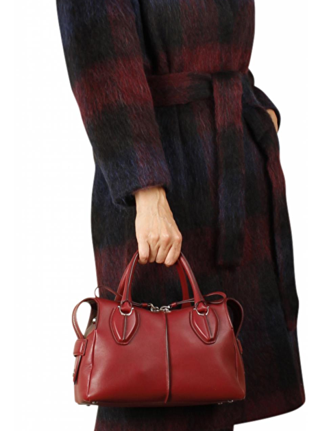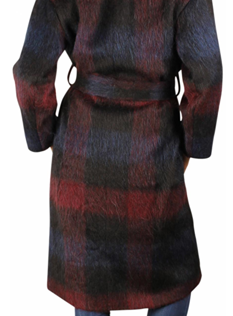 Lange jas aubergine marine geruit met zachte harige structuur. Deze sluit aan met één knoop en ceintuur in hetzelfde materiaal en heeft twee steekzakken. Binnenkant is zacht zwart gevoerd. De shawlkraag geeft de jas een vrouwelijke lijn.
