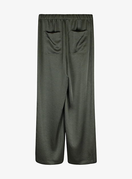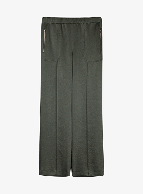 Detail: glanzend - elastische taille - aantrekkoord aan de binnenkant - opgestikte zakken met ritssluiting - gestikte persvouw - zakken aan de achterkant - brede broekspijpen.
