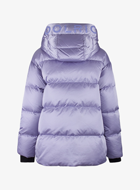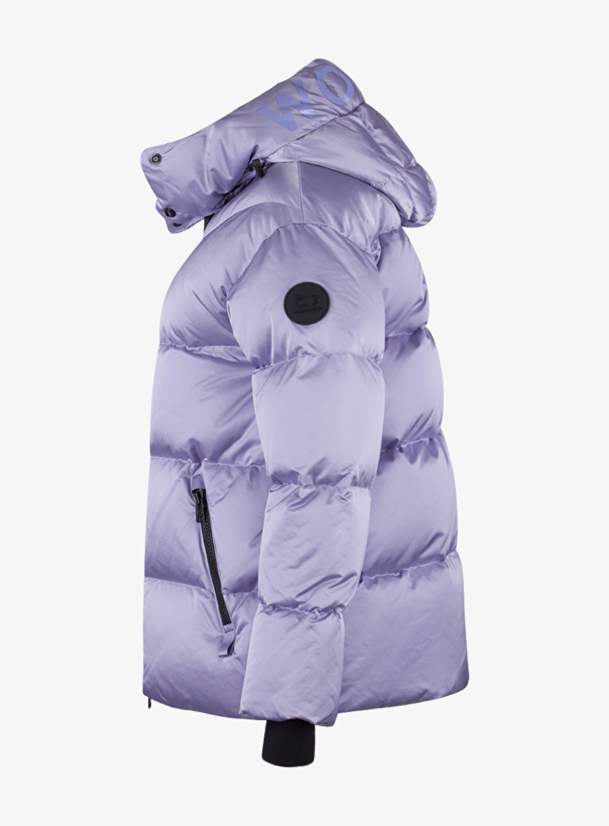Satin logo puffer lila met cap en zwarte ritsen en windvangers