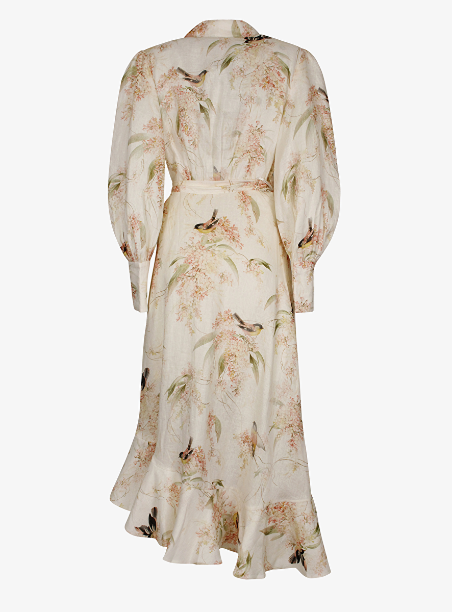 Detail: kraag - v-hals - stoffen wikkelstrik - ballonmouwen - manchet met ritssluiting - volants onderkant zoom - onderrok.